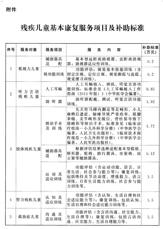 内蒙古残疾儿童基本康复服务项目及补助标准