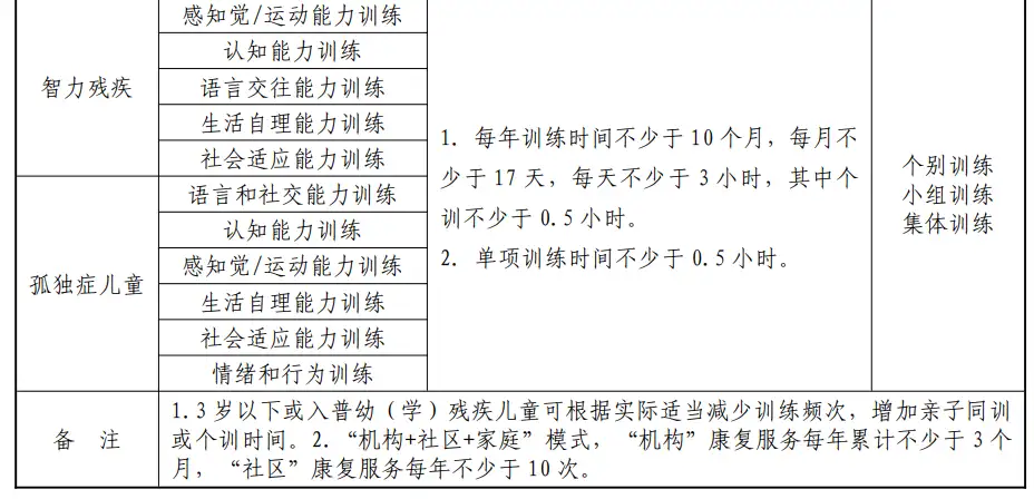 “机构+社区+家庭”模式,“机构”康复服务每年累计不少于3个月,“社区”康复服务每年不少于10次。