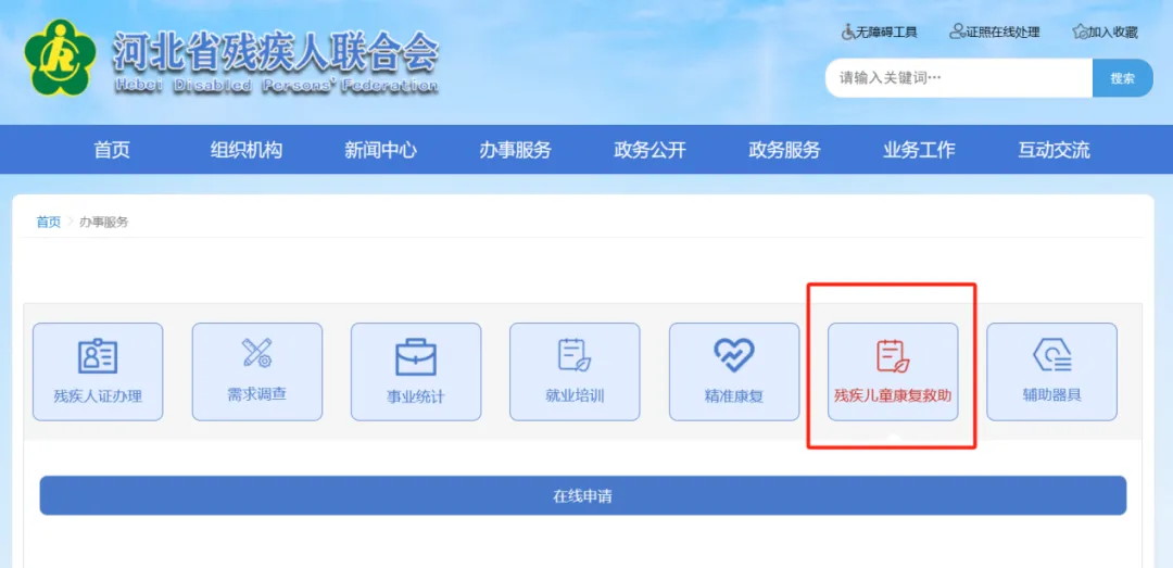 可以向残疾儿童户籍所在地(居住证发放地)县级残联组织提出申请或通过访问河北省残疾人联合会官方网站,在首页选择【儿童康复救助申报系统】申请,也可委托定点服务机构代为申请。