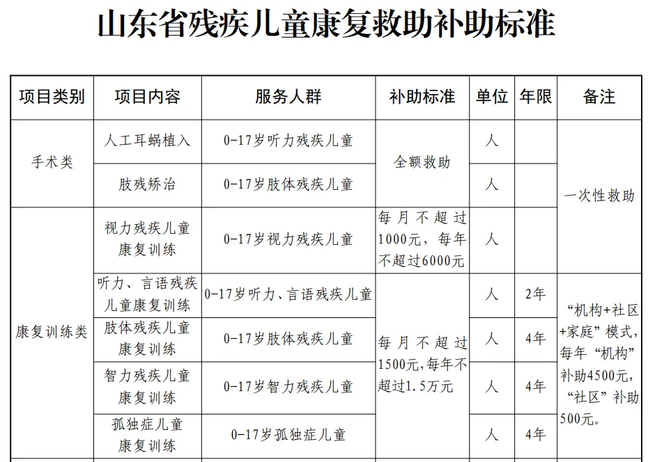 1.为0-6岁的残疾儿童提供定点康复机构全日制康复训练。每年训练时间不少于10个月。救助标准为15000元/人/年。