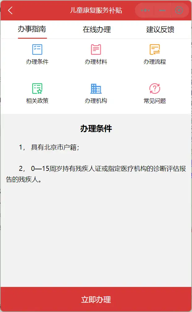 本市户籍,持有残疾人证或指定医疗机构的诊断评估报告,年龄0~15周岁。