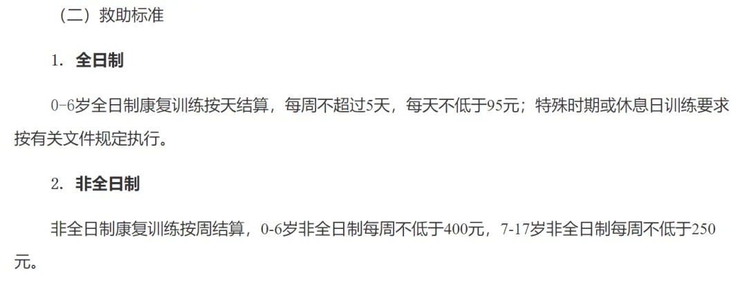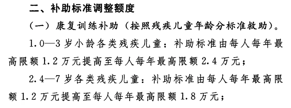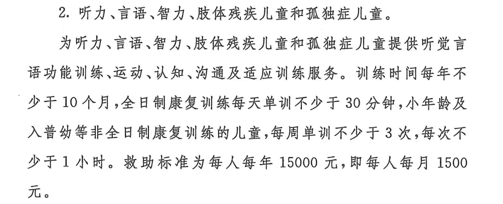 在救助年龄段内的残疾儿童享受两年以上基本康复训练救助,每人每年领取补贴1.2万元,机构康复训练时间不得少于10个月/年。