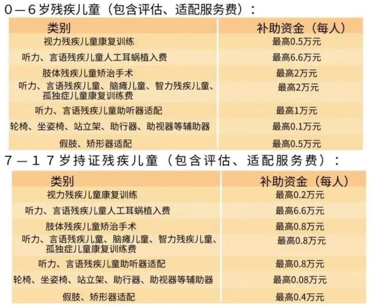 符合条件的0~6周岁视力、听力、言语、肢体、智力、自闭症等残疾儿童和7~17周岁持残疾人证的视力、听力、言语、肢体、智力、自闭症等残疾儿童。