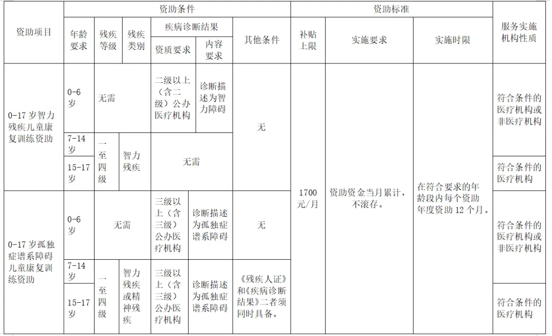 智力残疾、自闭症儿童:机构康复训练每人每月补助2000元,训练时间不少于1学年。