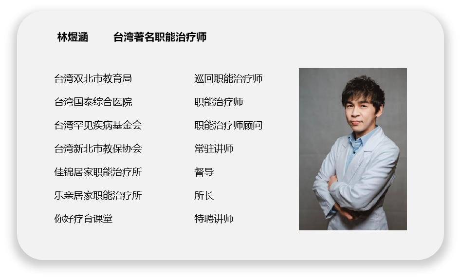 林煜涵老师,台湾人,祖籍福建省。于2000年毕业于台湾中山医学大学职能治疗学系,并考取了职能治疗师上岗证书。