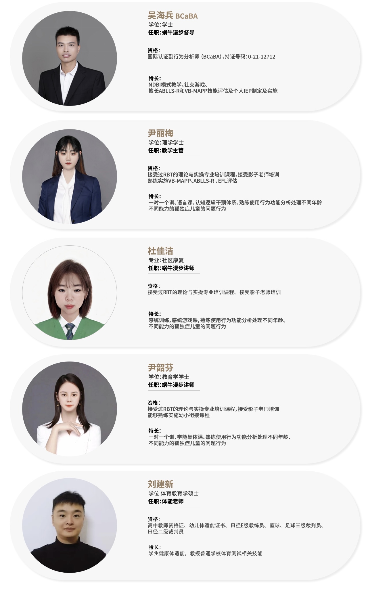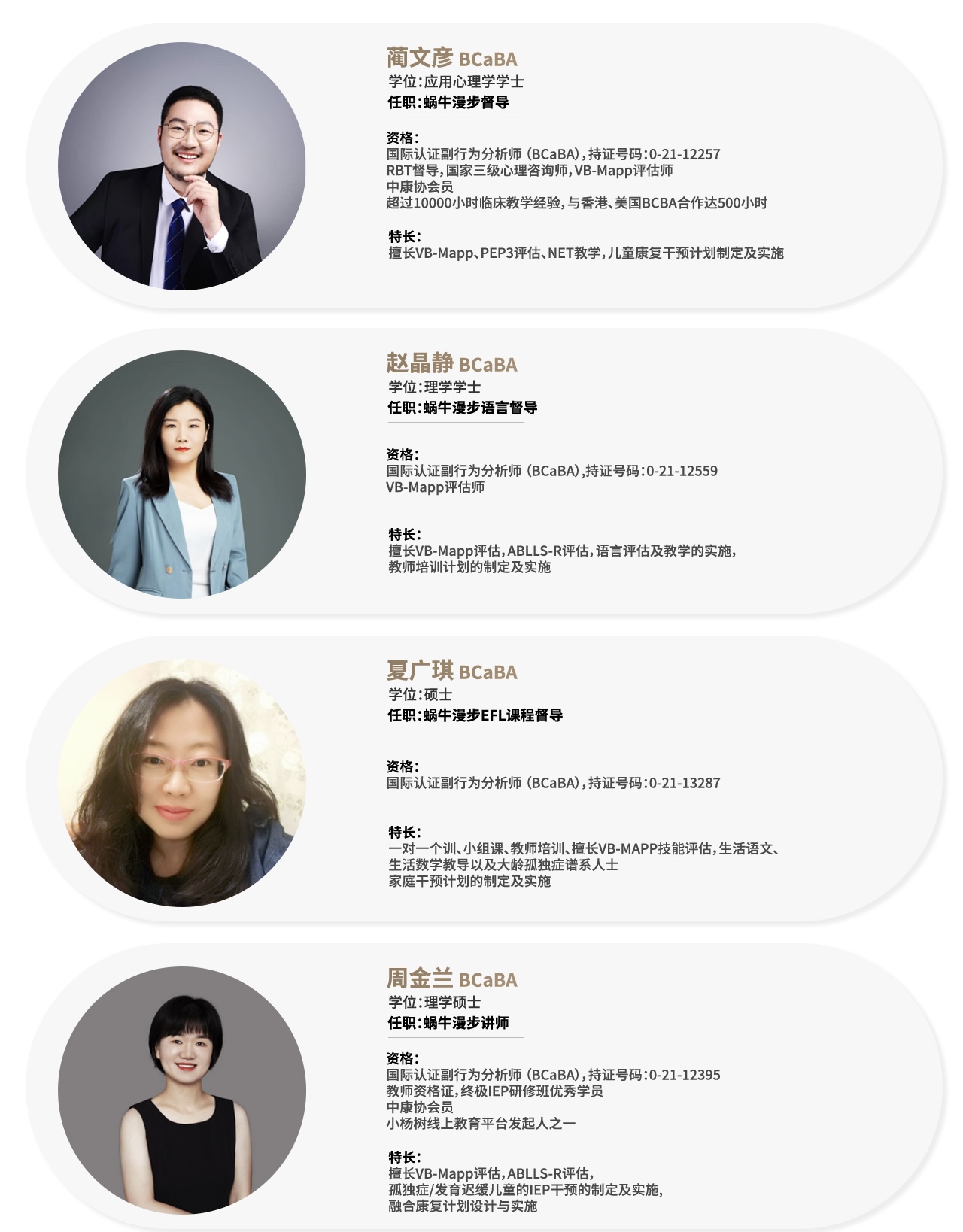 蜗牛漫步儿童展能中心是【中国BCaBA家长互助联盟】宁波地区的唯一成员,我们是一群从风雨中携手走来的家长,立志用最主流最先进最科学的干预理念和技术为广大特殊(自闭症)儿童家庭提供服务。为了自己的孩子,也为了千万和我们一样的家庭,这正是【中国BCaBA家长互助联盟】成立的初衷。